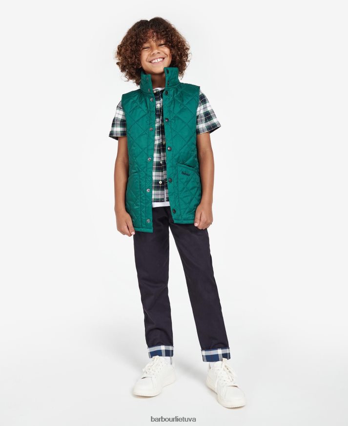 ši lengva liemenė yra stilingas pasirinkimas keliaujantiems vaikams. jis turi stovinčią apykaklę, dvi slystančias kišenes priekyje ir kontrastingą barbour logotipą kairėje kišenėje. Su klasikine dėžutės antklode ir užsegamu užsegimu ši apatinė suknelė puikiai tinka sluoksniais apsivilkti šaltesnėmis dienomis.